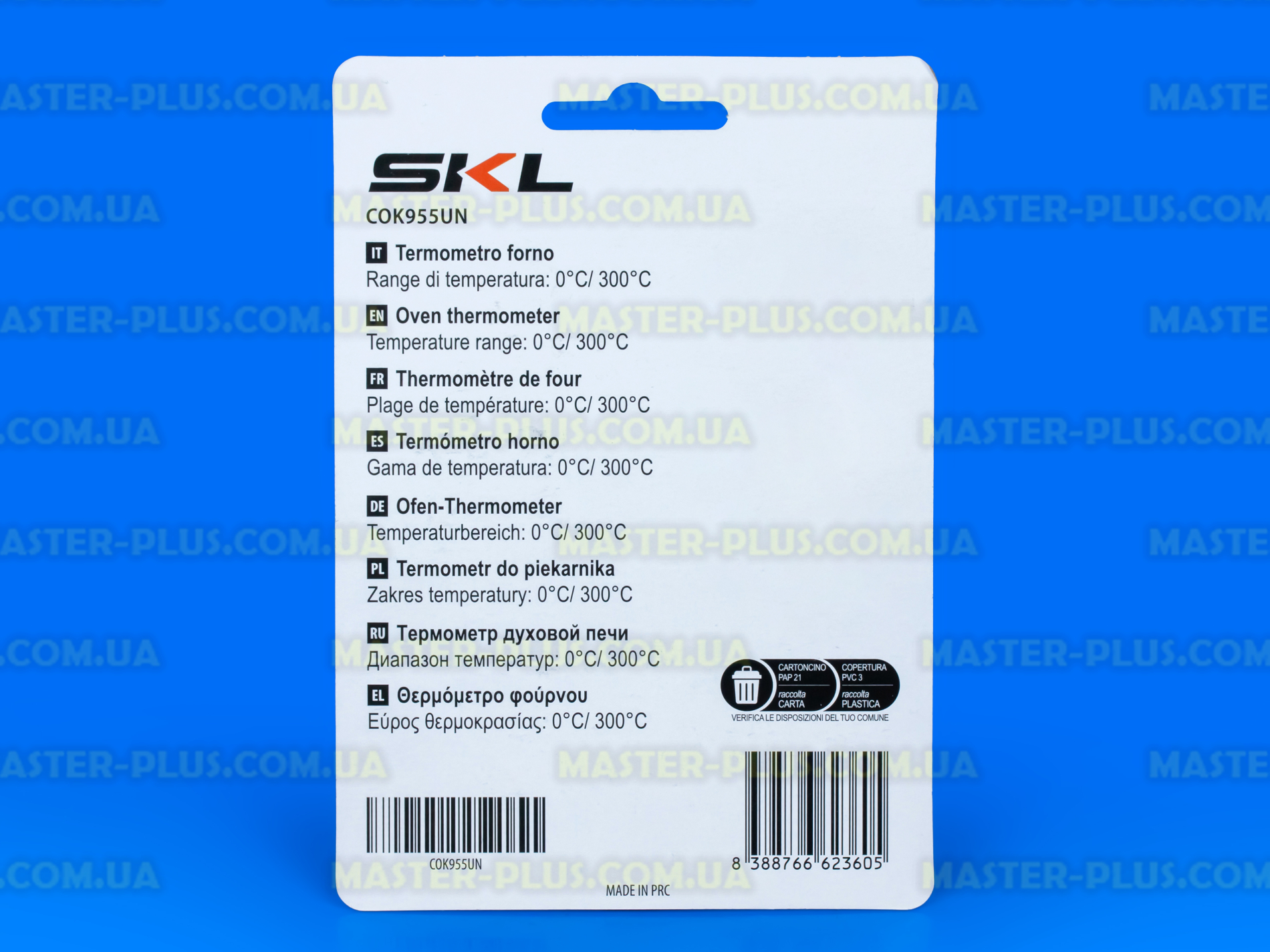 Измерение отображается стрелкой в градуированной радиальной шкале на белом фоне, в градусах Цельсия (°C). Термометр оснащен крючком для подвешивания за решетку, так же его можно просто устанавливать в удобном месте благодаря изогнутой металлической ножке.